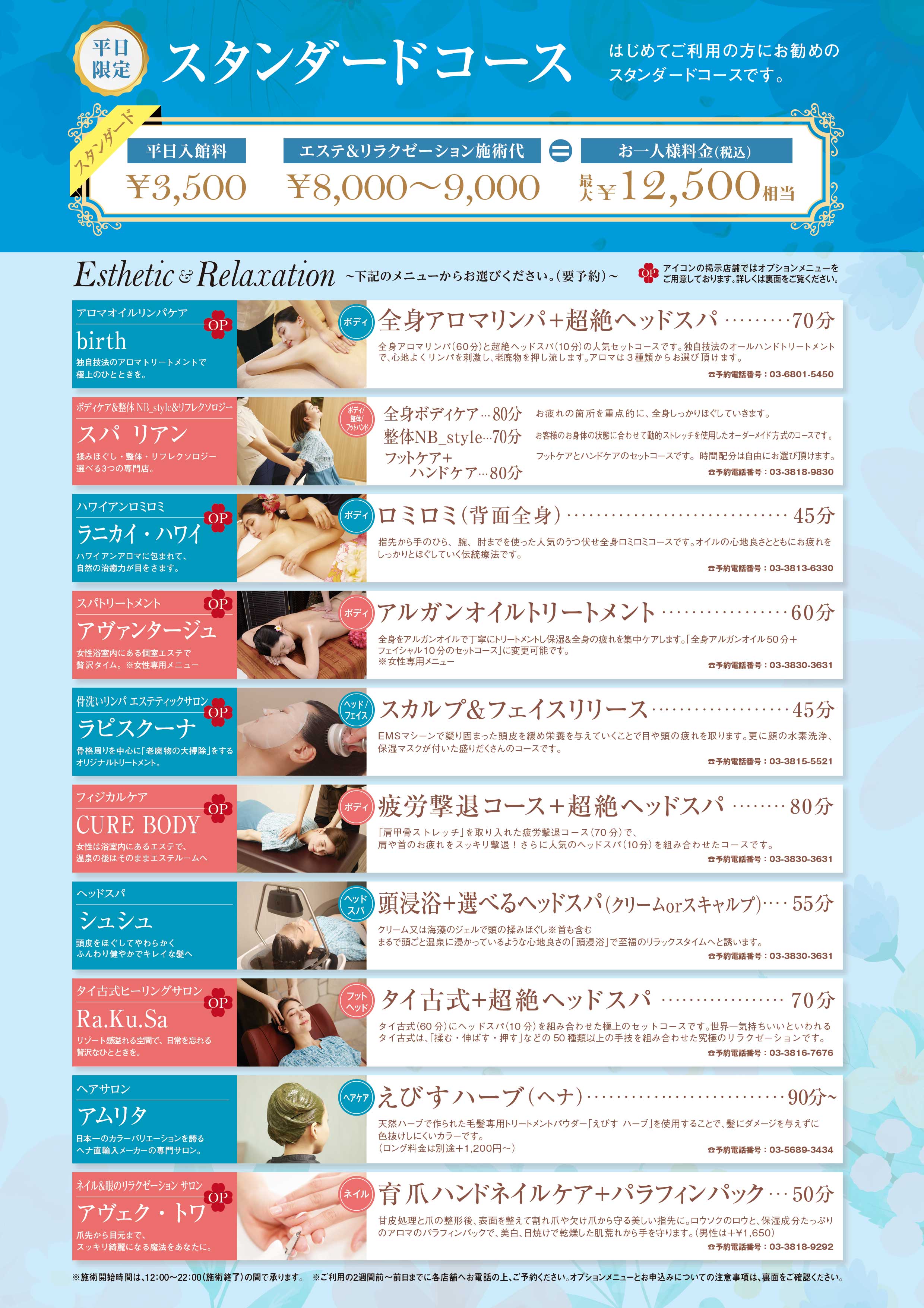 - お電話での事前予約は仮予約です。当日は施術開始時間15分前までにリストバンドとチケットを必ずお持ちの上、5F エステ&リラクゼーション専用カウンターにて本予約をお願いいたします。