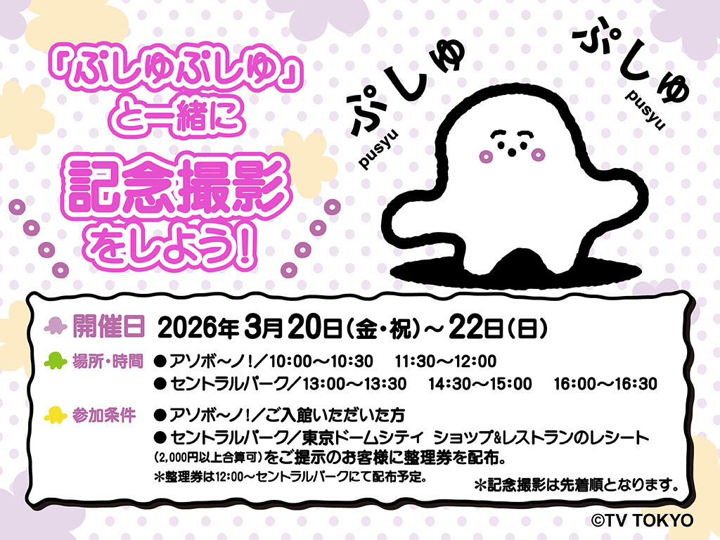 | 料金 | 無料(アソボ~ノ!入館料は別途必要) ※セントラルパークでお写真撮影に参加される場合は、東京ドームシティ ショップ&レストランのレシート(2,000円以上合算可)が必要となります。 |