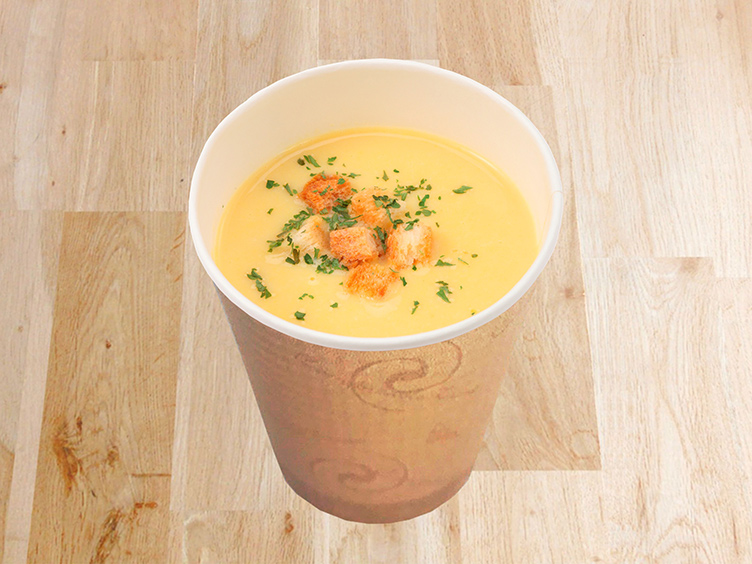 ①濃厚なコーンクリームとマザー牧場牛乳をたっぷり贅沢に使用したコーンスープは心温まるおいしさ。