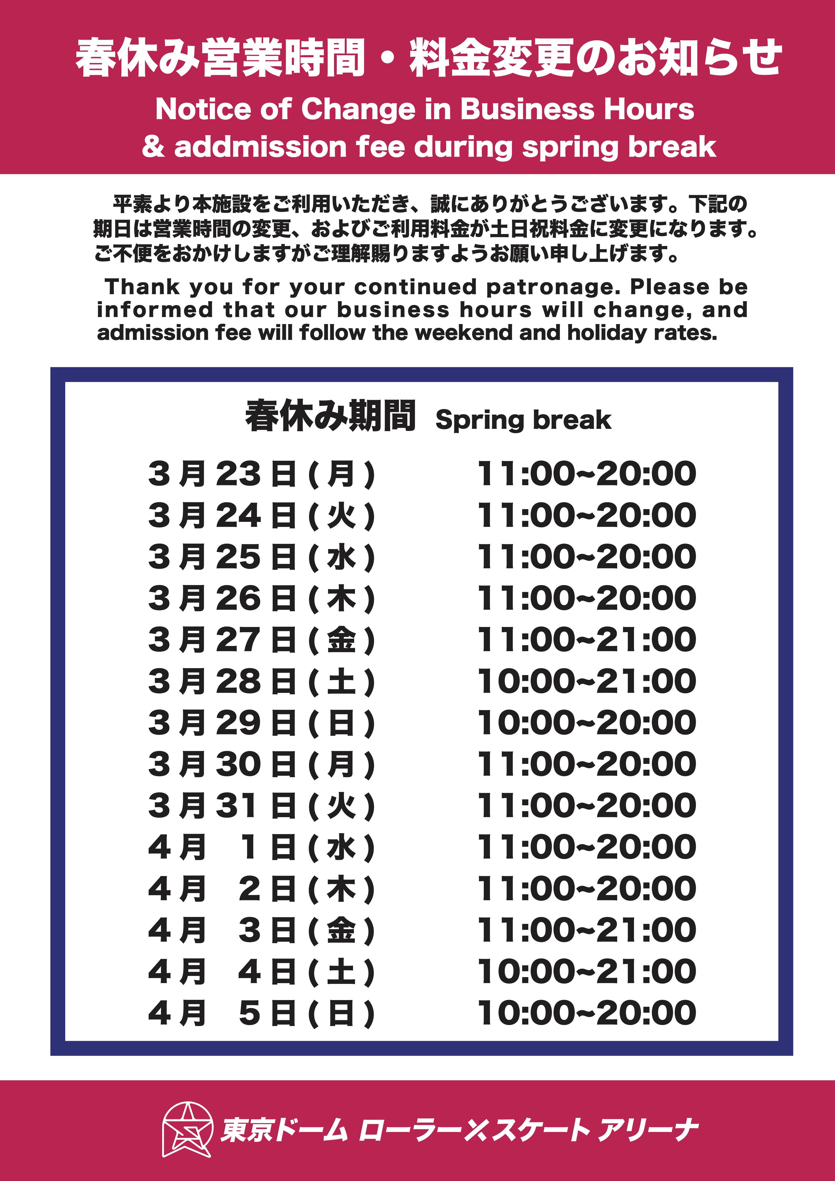 【春休みの営業時間】3月23日(月)~4月5日(日)