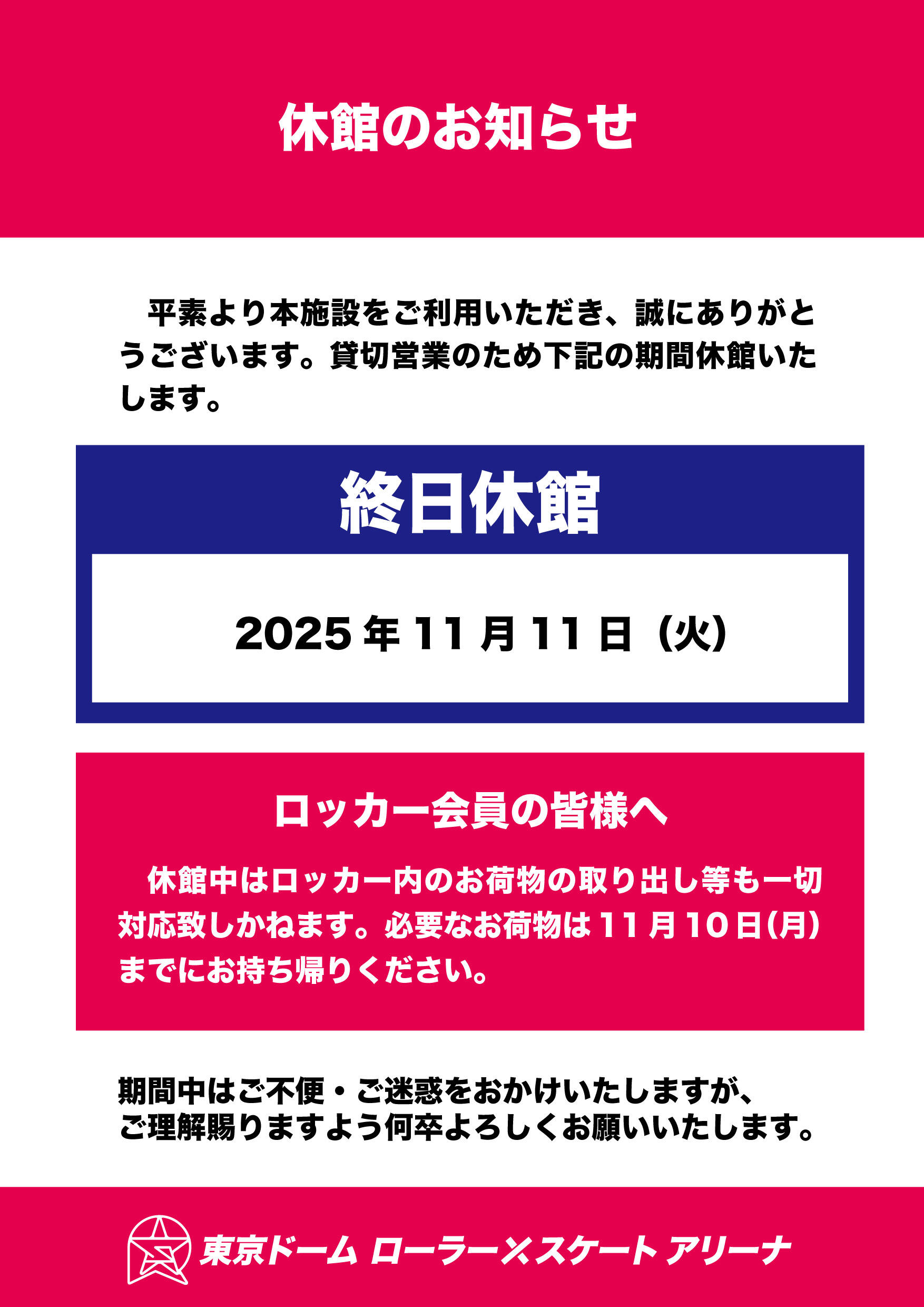 いつも東京ドームローラースケートアリーナをご利用いただき、ありがとうございます。