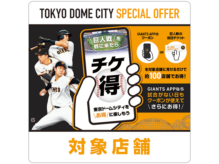 東京ドームシティの対象施設・店舗で当日のチケットやGIANTS APPを提示すると、お得な特典サービスが受けられます。
