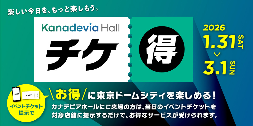 カナデビアホールの当日チケットを見せると対象店舗でお得なサービスが受けられる!お食事も!お買い物も!!お得な当サービスを利用して、東京ドームシティで楽しい1日をお過ごしください! 対象施設・店舗 ※他サービス、クーポン、割引との併用不可 アトラクションズ セントラルパーク ミーツポート ラクーア 後楽園ホールビル・黄色いビル周辺 HIGUMA Doughnuts ■1,000円(税込)以上のご利用でお会計より5%OFF ※他イベントコラボ商品は対象外 バイキングゾーン ROBERT'S COFFEE ■お会計より5%OFF バイキングゾーン THE土産SHOP ■お会計より5%OFF ※一部除外品あり バイキングゾーン ミルポテ sweets&potatoes ■ミルポテBOX Mサイズ or Lサイズご注文で対象のドリンク1点無料 ※BOX1つご注文につきドリンク1杯サービス バイキングゾーン モンマスティー ■全商品サイズアップ バイキングゾーン くまさんのカステラ ■8クマお買い上げで3クマ増量、15クマお買い上げで5クマ増量 ※1会計で1回のみ スプラッシュガーデン びっくりドンキーポケットキッチン ■お会計より10%OFF フードコートGO-FUN blue-ing! ■CAFE&BAR限定 お会計より5%OFF ※CAFE &BARのみ(Shop、Discoveryは適用外) ※貸切等ご利用できない場合もございます。詳しくは店舗へお問い合わせください ※他イベントコラボ商品、限定メニュー、団体プラン、宴会プラン、パーティーメニュー等予約商品は対象外 セントラルパーク POKE BOWL CLUB TOKYO ■フードご注文でホットコーヒープレゼント プリズムホール―ホテル間通路 カフェ アリヤ ■フレンチトーストご注文でチョコソースのトッピングプレゼント セントラルパーク芝生広場前 バイロンベイミートパイ ■1,500円(税込)以上のご利用でお会計より100円引き セントラルパーク芝生広場前 TOKYO KAKI STAND ■お会計より10%OFF ※ドリンクのみのお会計は不可 ミーツポート周辺 叙々苑 ミーツポート店 ■ドリンク1杯無料 ※一部除外品あり ※1品以上をご注文のお客様に限る ミーツポート 4F 花とごはんとクリームソーダ なぎさ食堂 ■ミニデザートサービス ※他イベントコラボ商品は対象外 ※1品以上をご注文のお客様に限る ミーツポート周辺 creperie kenny's ■ざくざくオレオバナナチョコ生クリームクレープ100円引き ラクーア 2F HUB ■お会計より10%OFF ※パーティーには使用不可 ラクーア 1F nana’s green tea ■1,000円(税込)以上のお買い上げでお会計より10%OFF ラクーア 3F petit main ■お会計より5%OFF ラクーア 4F アメリカンホリック ■お会計より5%OFF ※1,000円(税込)以下およびセール商品(30〜70%OFF)には使用不可 ラクーア 3F セゾンファクトリー ■2,160円(税込)以上のご利用でお会計から5%OFF ラクーア 2F チーズ&ドリア.スイーツ ■ソフトドリンク1杯無料 ※店内でお食事された方に限ります ※チケットを先にご提示のお客様に限ります ラクーア 2F ミゲルフアニ ■2,500円(税込)以上のご利用でお会計から10%OFF ※コース併用不可 ラクーア 1F 添好運 ■ソフトドリンク1杯無料 ラクーア 2F JACK IN THE DONUTS ■ギャラクシードーナツ1点プレゼント ※ドーナツ1点以上ご購入のお客様に限ります ※売り切れの場合は代替商品に変更となります ラクーア DELI&DISH With Green ■スタンダードトッピング1つ無料 ラクーア DELI&DISH DUMBO Doughnuts and Coffee ■ドリンク、ドーナツそれぞれご購入で10%OFF ※他イベントコラボ商品は対象外 ※ドリンクのみのお会計は不可 ※一部除外品あり ハイ!エブリバレー 2F アニタッチ ■入園料100円引き ハイ!エブリバレー 1F タイ料理ダオタイ ■1,500円(税込)以上のご利用でお会計より10%OFF ※他イベントコラボ商品は対象外 ハイ!エブリバレー 1F 山本のハンバーグ MeatBall and Wine ■1,000円(税込)以上のご利用でお会計より10%OFF ※他イベントコラボ商品は対象外 ハイ!エブリバレー 1F A destra Salvatore ■お会計より10%OFF 黄色いビル 2F FOOD STADIUM TOKYO クラフトビアマーケット ■お会計より10%OFF 黄色いビル 2F FOOD STADIUM TOKYO チャルモゴッソヨ ■お会計より10%OFF 黄色いビル 2F FOOD STADIUM TOKYO ニュー大金星 ■1,000円(税込)以上のご利用でお会計より10%OFF 黄色いビル 2F FOOD STADIUM TOKYO ベトナム屋台バインセオサイゴン ■お会計より10%OFF 黄色いビル 2F FOOD STADIUM TOKYO ラーメン&酒バル 麺屋一燈 ■お会計より10%OFF 黄色いビル 2F FOOD STADIUM TOKYO 蟻月 ■お食事ご注文の方、ソフトドリンク1杯無料 ※ドリンクのみのお会計は不可 ※お食事1品以上をご注文のお客様に限る ※メガサイズは除く 黄色いビル 2F FOOD STADIUM TOKYO