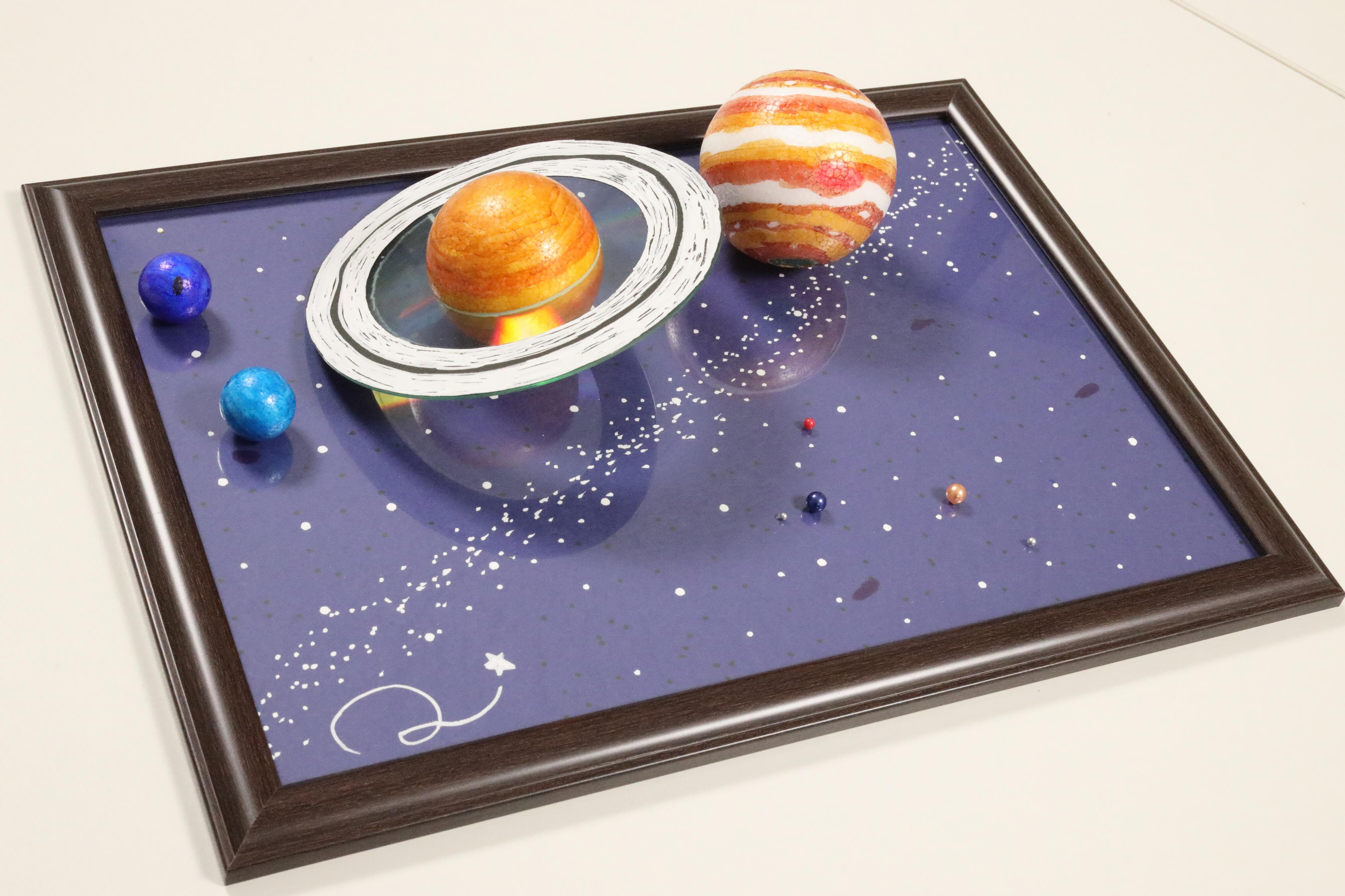 太陽系にある8つの惑星の模型を作るワークショップを開催します。それぞれの惑星の大きさに合わせた模型に模様を描き、背景に絵を描いて、自分だけの惑星模型を作りましょう。