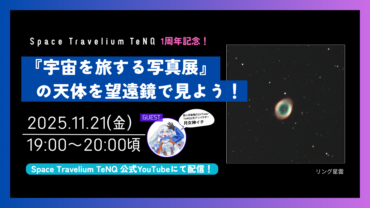 『Space Travelium TeNQ 宇宙を旅する写真展』にちなみ、展示される60点以上の美麗な天体写真の中から、いくつかの天体を実際に望遠鏡で観望し、写真と見比べてみます。夜空の天体が天体写真のように美しいのか、確かめてみましょう。今回は、新人宇宙飛行士 VTuber・TeNQ 公式アンバサダーの月女神イチさんをゲストにお迎えします。