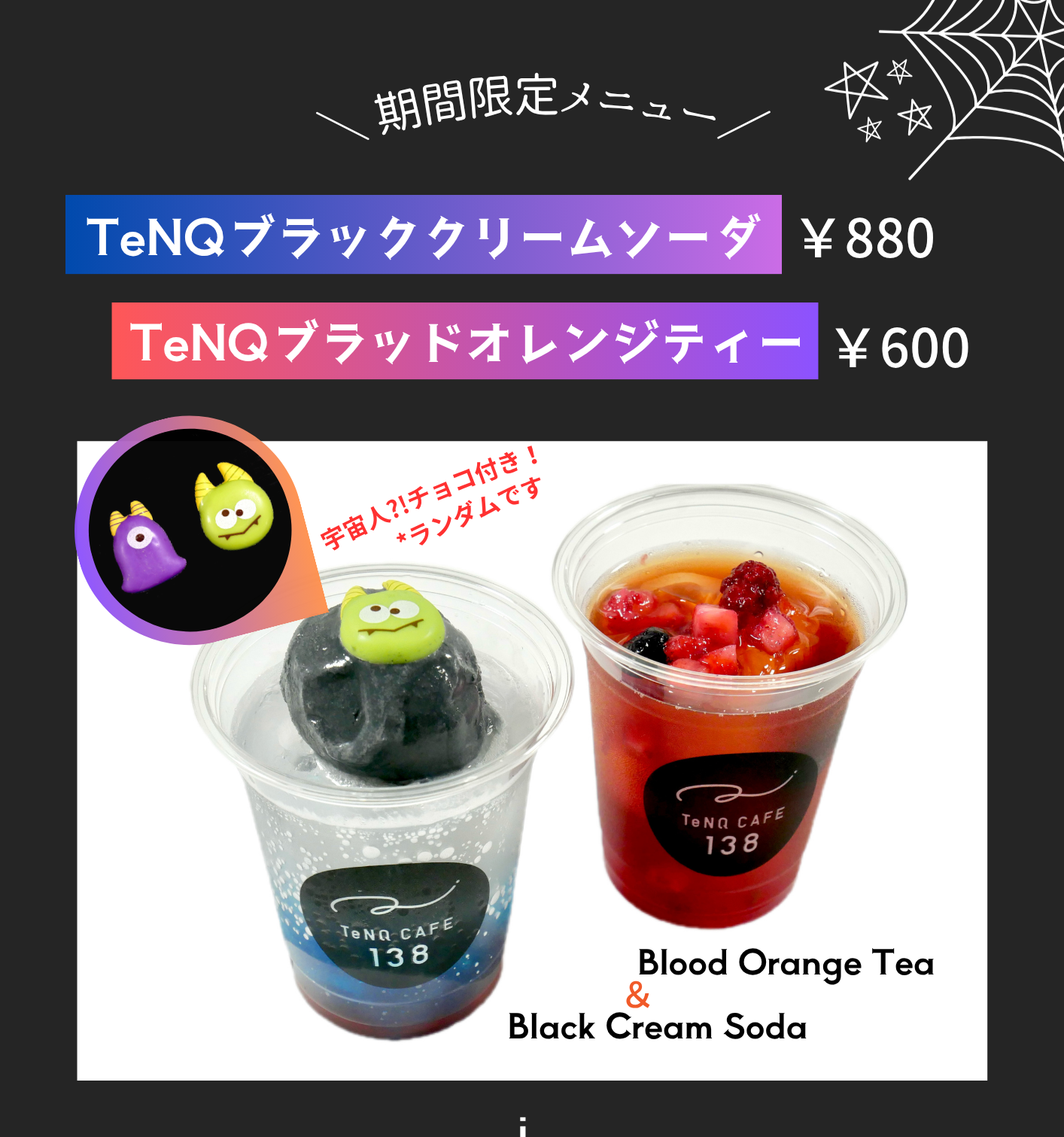 「TeNQ CAFE 138」にて、秋の期間限定ドリンクを販売中です。真っ黒なアイスが主役のクリームソーダと、フルーティなブラッドオレンジティーの2種類、ぜひお試しください。