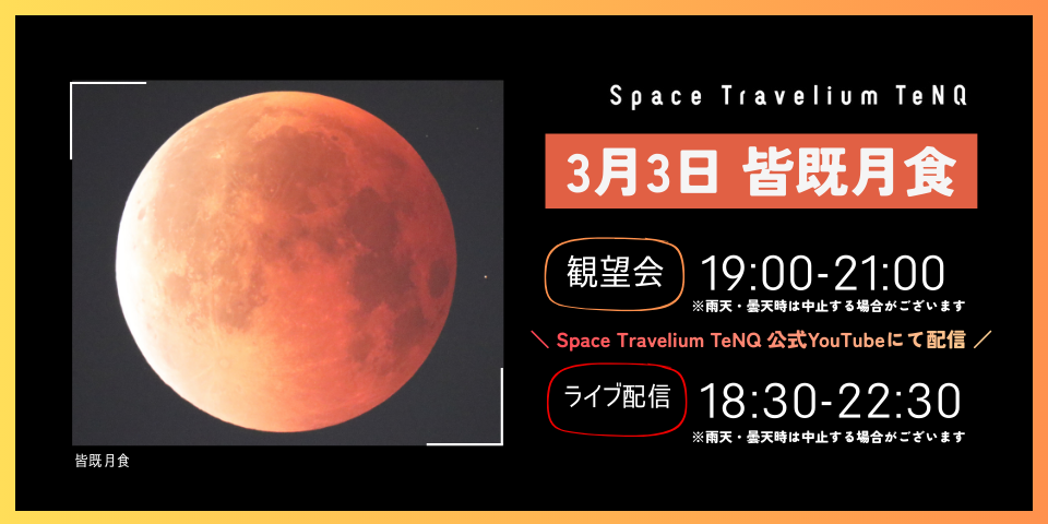 東京ドームシティの「Space Travelium TeNQ」から、望遠鏡で皆既月食の様子をお届けいたします。月が地球の影に隠れ始めてから、全部隠れて再び現れるまでを、ライブ配信いたします。